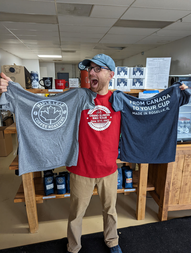 This is our 2022 edition of the Maple Leaf Roasters shirt. This Next Level shirt is a very soft triblend tee in navy and heather grey options, shows our logo on the front and proudly announces that we're made in Roselle, IL (or Canada, whichever you prefer)!
