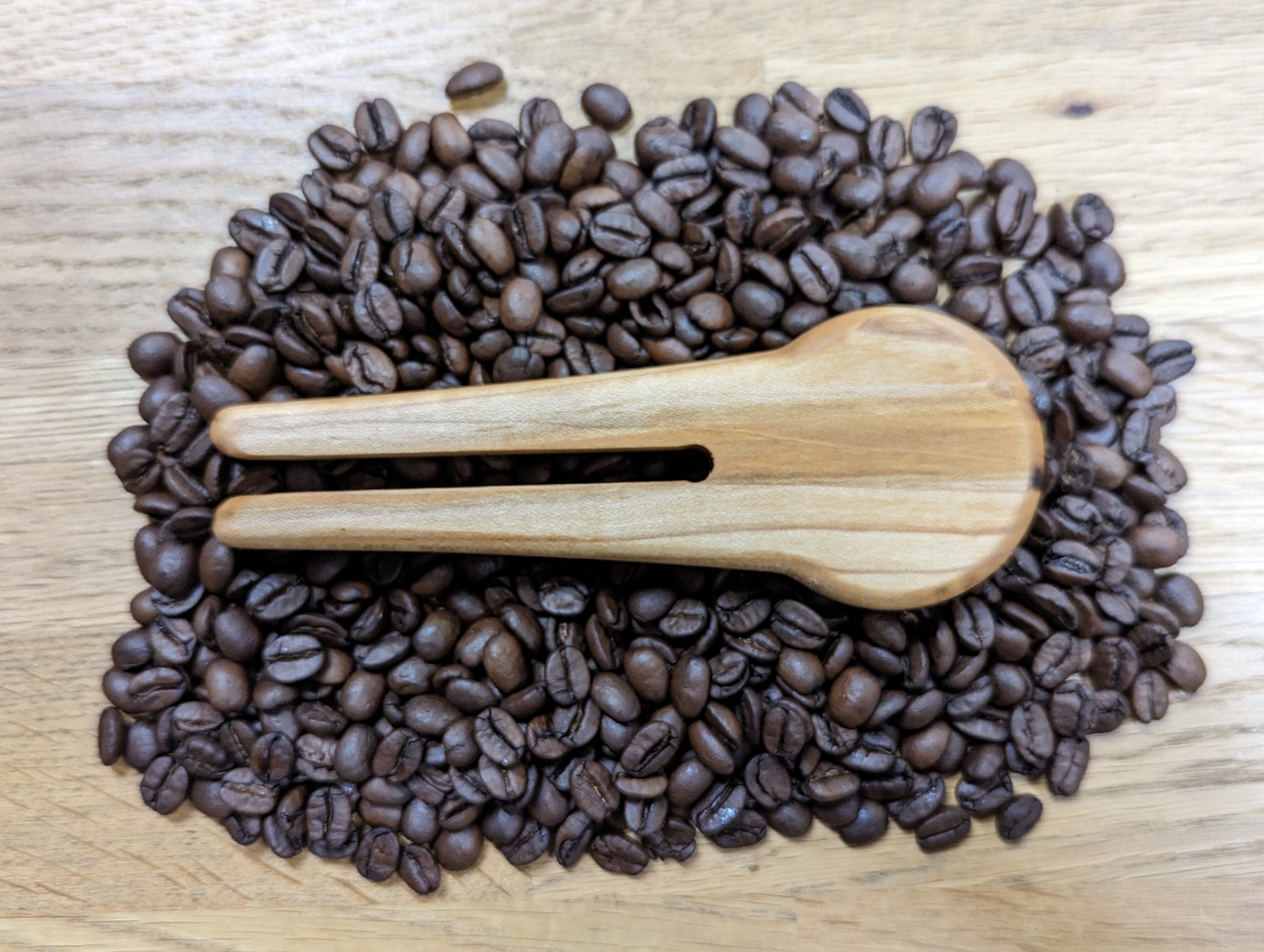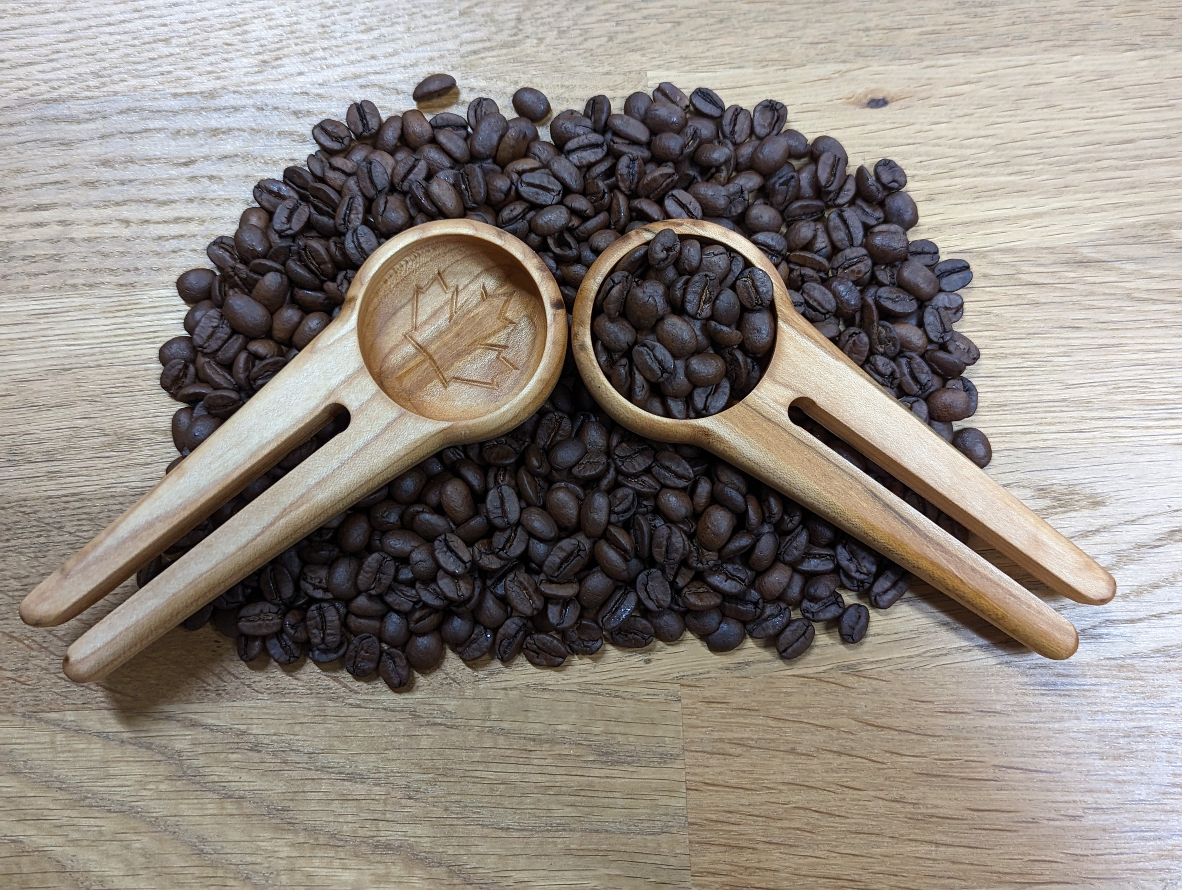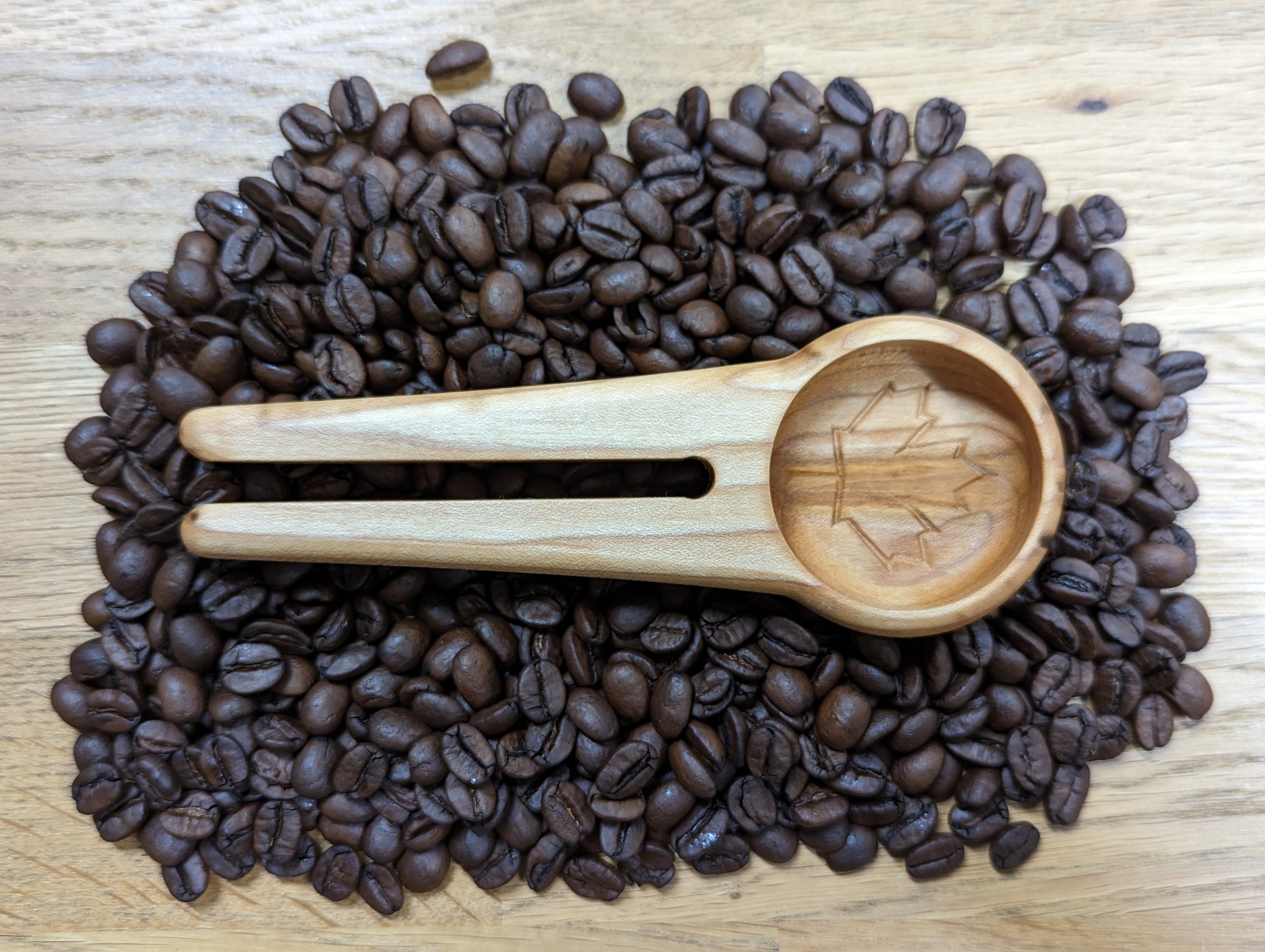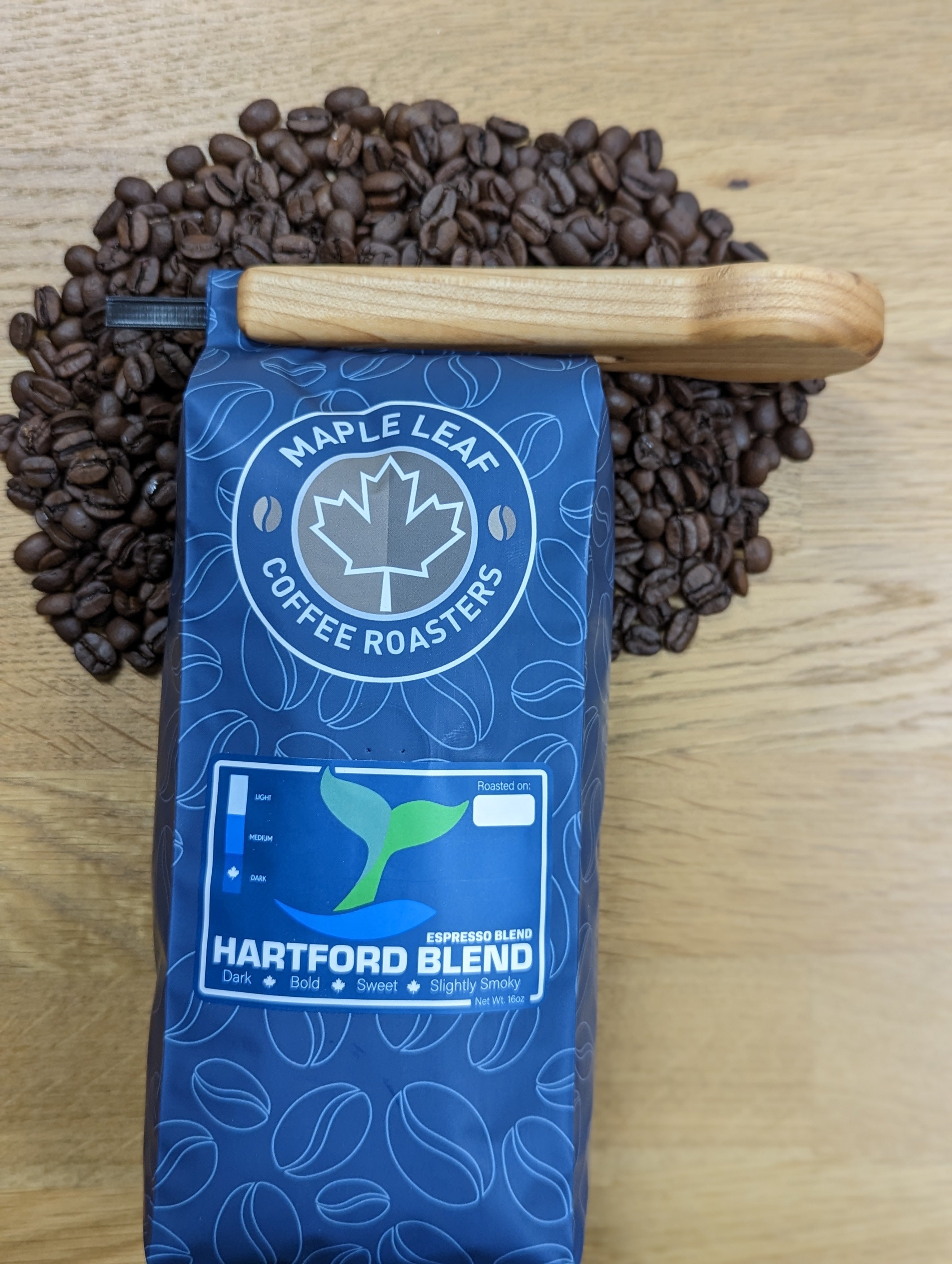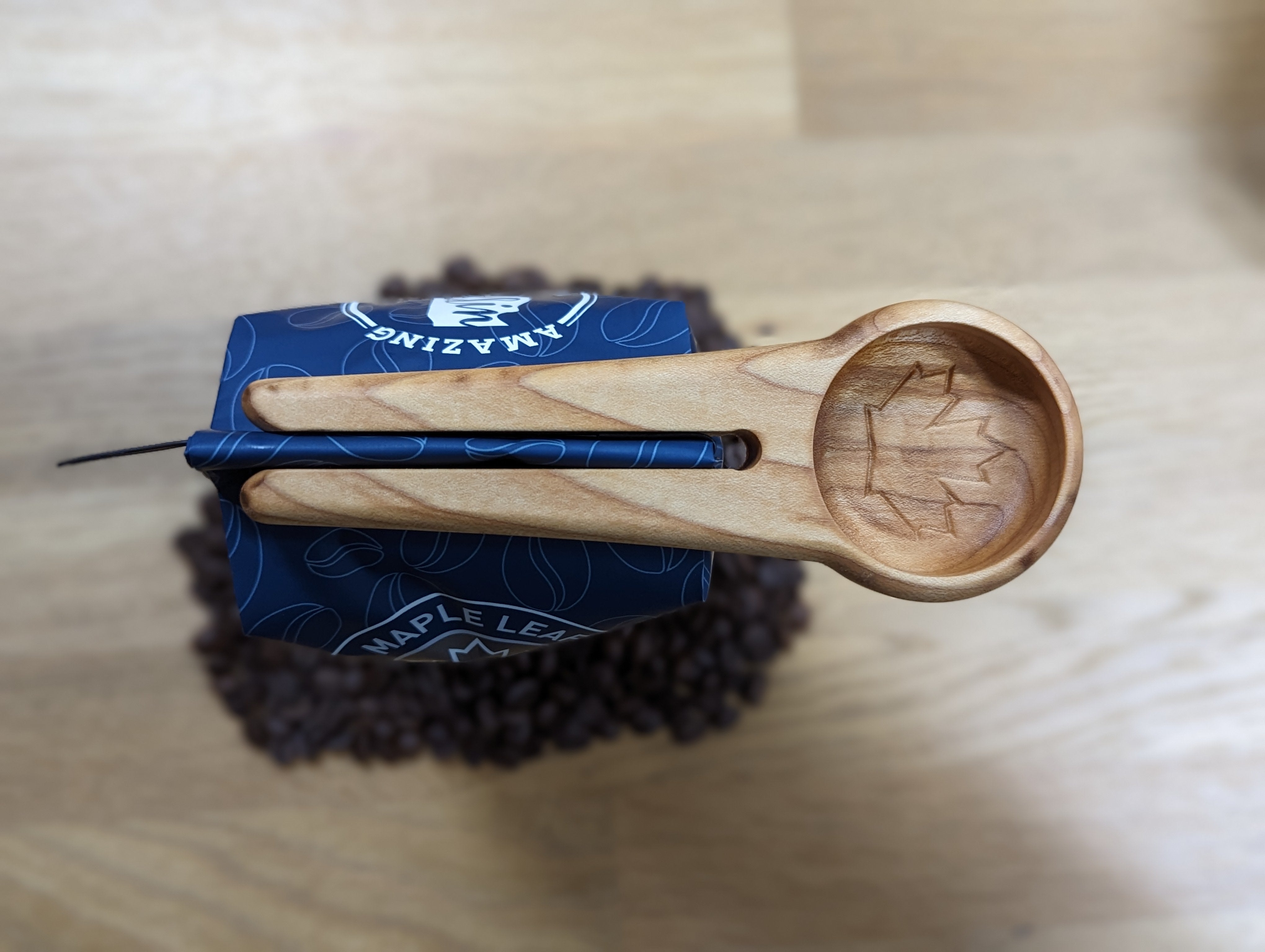 This hand crafted, Maple Leaf branded coffee scoop and bag clip is the perfect multi-use tool to pair with a bag of our coffee. It can be clipped on to the top of one of our bags and used to scoop out beans from any bag.
