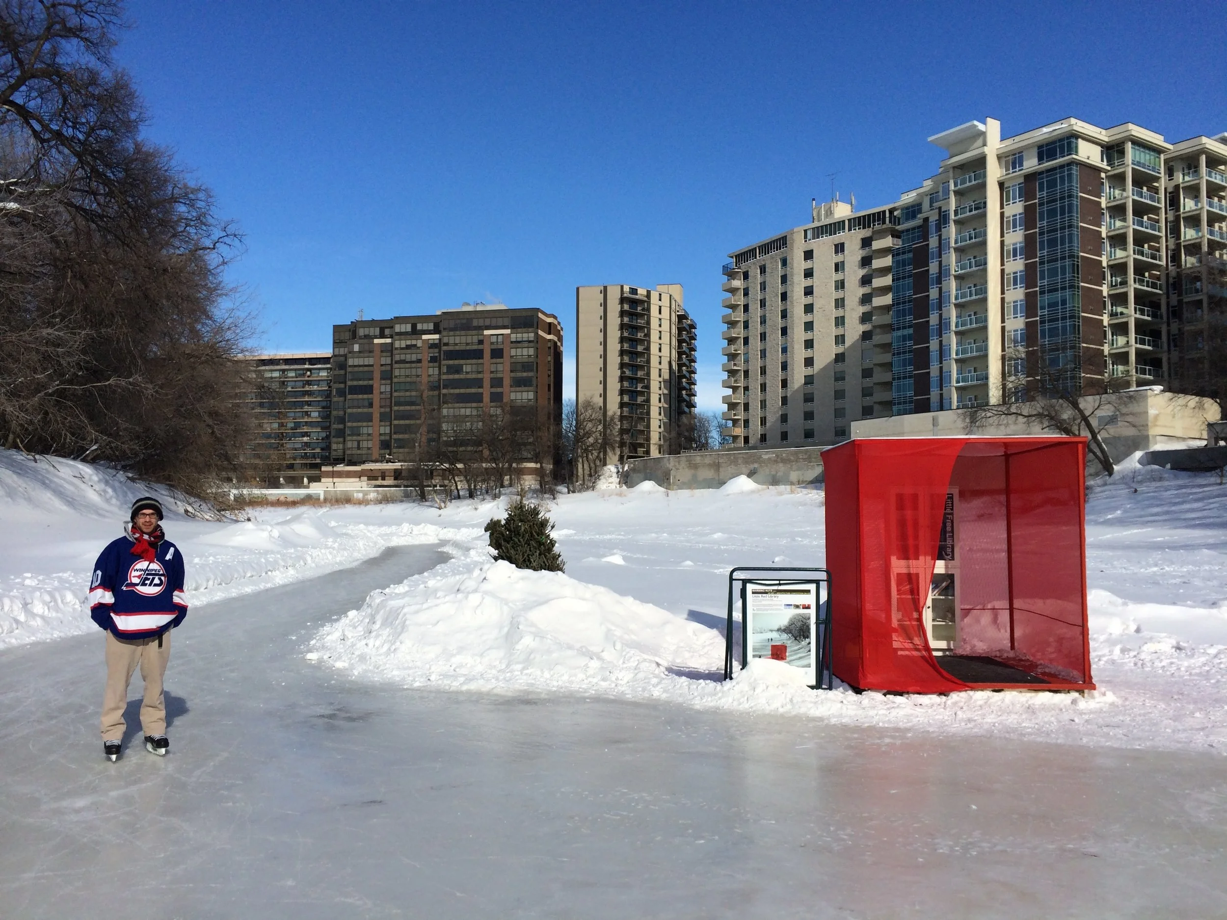 Here is Alex, wearing a classic Winnipeg Jets sweater, skating on the river in Winnipeg. Hope that answers your question.